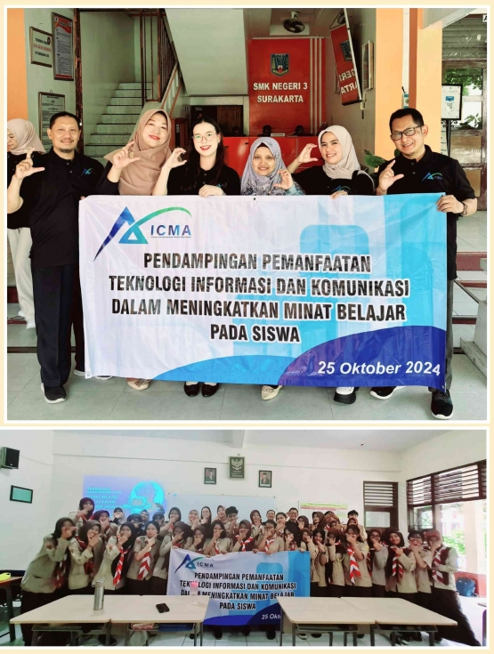Pada tanggal 25 Oktober 2024, Ikatan Cendekiawan Muda Akuntansi (ICMA) menyelenggarakan kegiatan Pengabdian kepada Masyarakat (PKM) di SMKN 3 Surakarta. Kegiatan ini merupakan salah satu rangkaian acara Dies Natalis ICMA yang ke-3. Mengusung tema "Pendampingan Pemanfaatan Teknologi Informasi dan Komunikasi dalam Meningkatkan Minat Belajar pada Siswa," PKM ini berfokus pada bagaimana siswa SMKN 3 Surakarta dapat mengoptimalkan penggunaan teknologi informasi dan komunikasi (TIK) untuk meningkatkan motivasi dan minat belajar mereka.